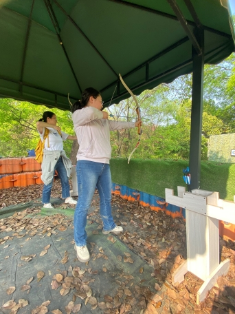 射箭,作為古老而又充滿魅力的運(yùn)動(dòng),激勵(lì)著隊(duì)員躍躍欲試,都想體驗(yàn)一把拉弓的感覺,只見隊(duì)員們挺立拉弓、瞄準(zhǔn)、放箭,行云流水的一系列動(dòng)作,充滿著力量與美感。當(dāng)箭矢劃破長空,飛向靶心,仿佛看到了自己內(nèi)心的成就和滋美,在原始生態(tài)中蘊(yùn)含出力量的綻放。